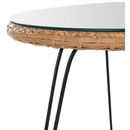 Crafted for outdoor durability, this modern set includes two armchairs and a coffee table with sleek hairpin legs, offering a retro aesthetic accented with woven all-weather cording similar to rattan. Each chair is equipped with weather-resistant foam cushions, while the coffee table is topped with a glass surface for convenience.