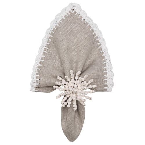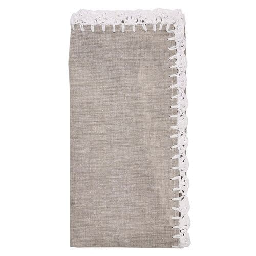 The Shell Edge Napkin's hand-crocheted raffia edging packs a lot of personality. An organic update to a classic linen napkin, this bestseller features a linen napkin with a contrasting border. It is a napkin that can go from a garden party to a chateau entertaining, from the seaside to a log cabin, and from bohemian-inspired table settings to tables that ooze rustic charm. Available in a variety of colorways.