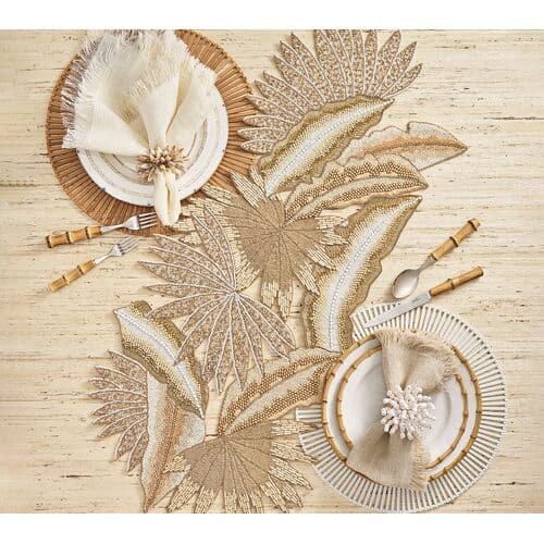 The elaborate hand-made Shell Fringe Napkin Ring is fashioned from acrylic shells that capture the natural shades of seashells. Sitting atop a raffia base ring, the cluster of shells creates a fringe when placed on a napkin.