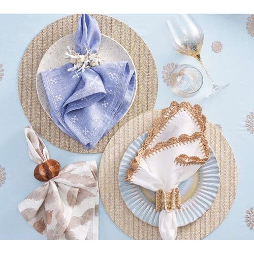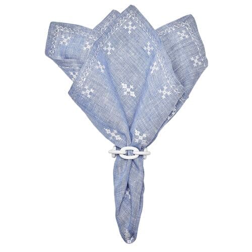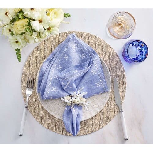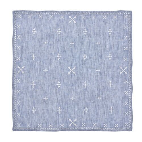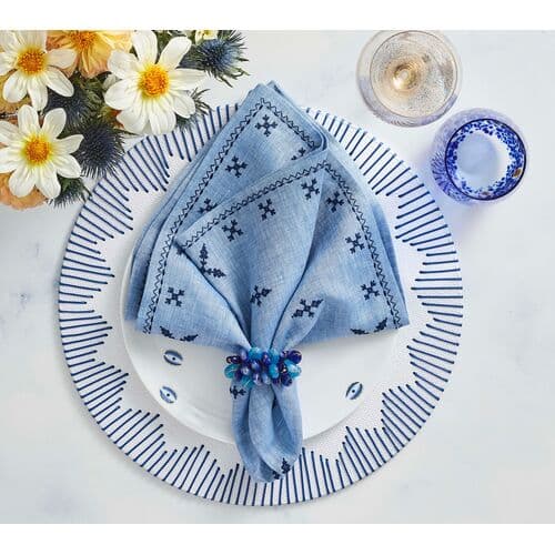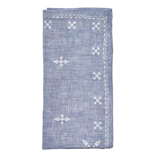Traditional Moroccan embroidery inspired the linen Fez Napkin. The napkin features embroidered details arranged in a symmetrical pattern across the napkin. A striped embroidered border completes the festive napkin.