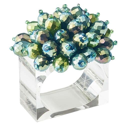 The Zinnia Napkin Ring features shimmering beads subtly mimicking elegant flower petals. The delicate napkin ring sits atop a square clear acrylic base. This sophisticated napkin ring elevates any elegant table setting.