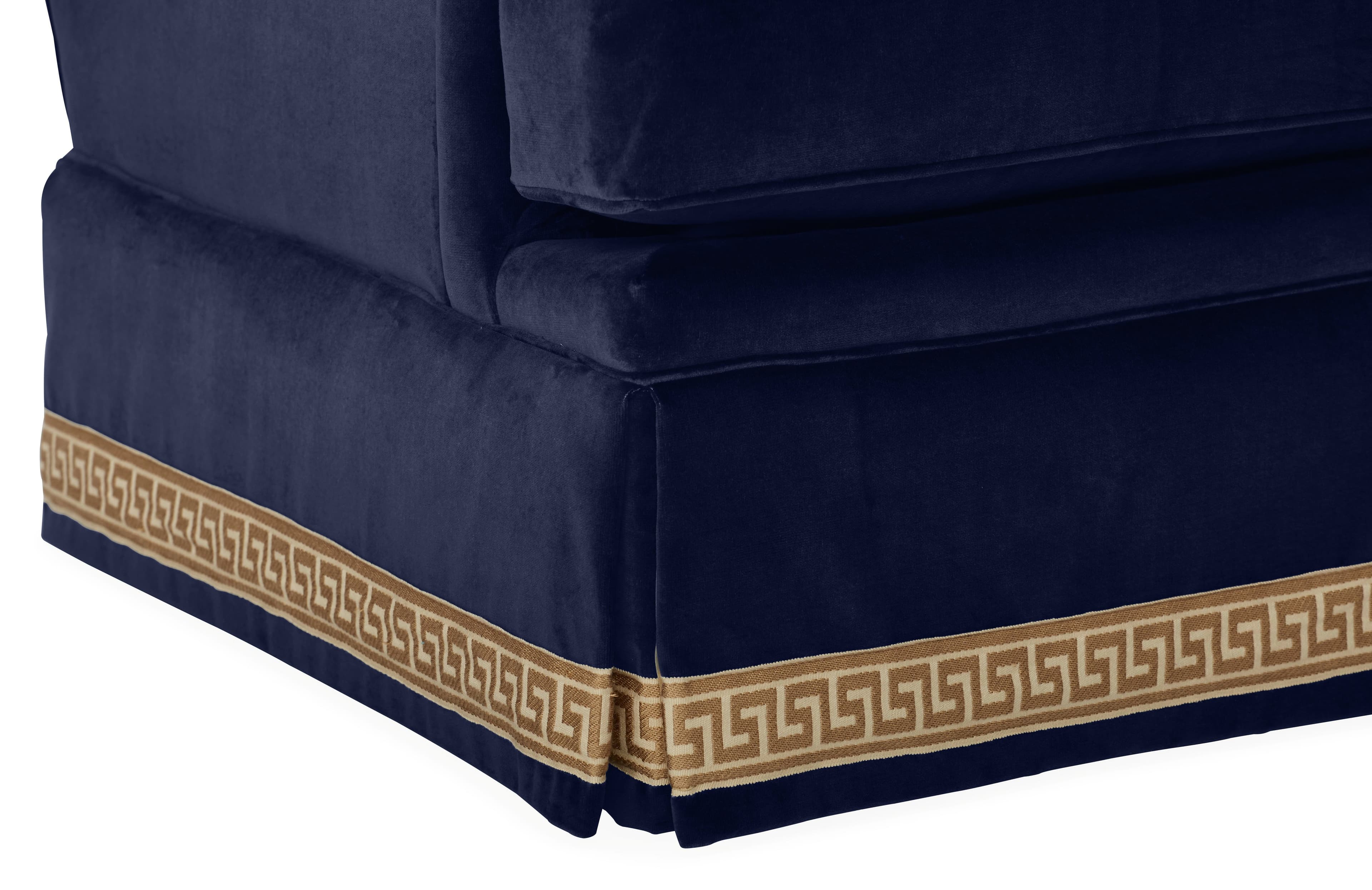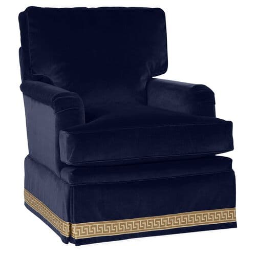 Featuring a wrap-around waterfall skirt, English arms, and embroidered trim, this club chair offers a sophisticated look. Its sturdy construction boasts a hand-tied eight-way suspension system and fiber-wrapped foam, ensuring comfort and support. This chair is handmade in the USA.