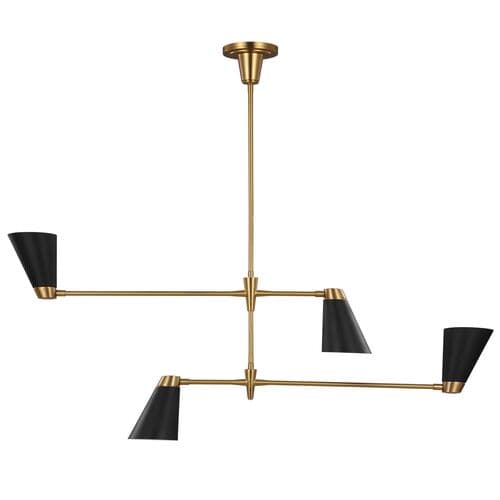 A cutting-edge, even whimsical interpretation of time-honored silhouettes, this four-arm chandelier juxtaposes a gleaming brass finish against black triangular shades.Thomas O’Brien is a master at bridging traditional and modern, whether in his acclaimed interiors, his signature home furnishings, or his New York store, Aero. His designs for Generation Lighting make it easy for you to incorporate his distinctive aesthetic into your home.