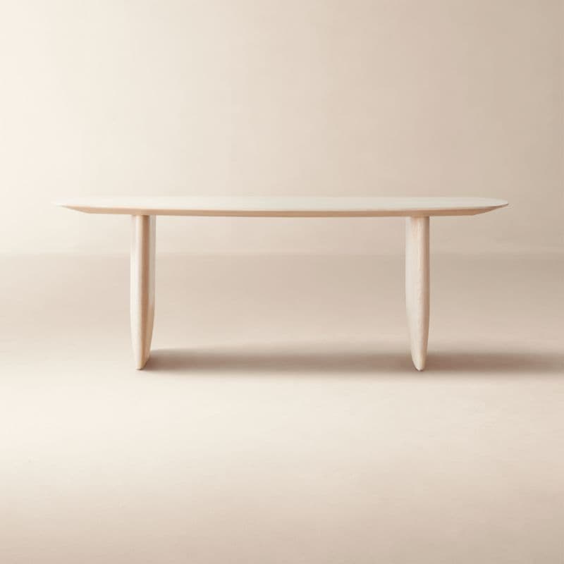 Crafted from FSC ®-certified solid oak, dining table designed by goop is a fresh take on retro-chic style. White washed with rounded edges, the surfboard-inspired table is elevated and cool, perfect for hosting a laid-back gathering for six. CB2 exclusive.Designed by goop. FSC ®-certified oak and engineered wood with white washed finish. Seats up to six. Characteristics of wood include variation in tone, natural knots and markings. Keep out of direct sunlight to prevent fading. Wipe spills immediately. Coasters and placemats recommended. Clean with a soft cloth; no abrasive cleaners. Made in Indonesia.