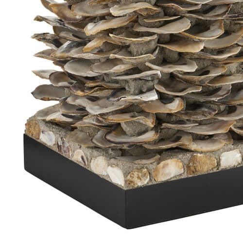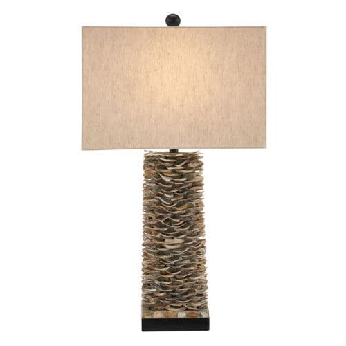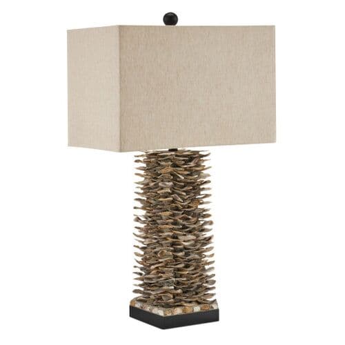 Stacked oyster shells applied by hand to the pedestal of the Villamare Table Lamp create a textural column rising from a satin black wood base. This is one of our painstakingly hand-applied artisanal pieces. The shell table lamp is topped with an oatmeal linen shade.