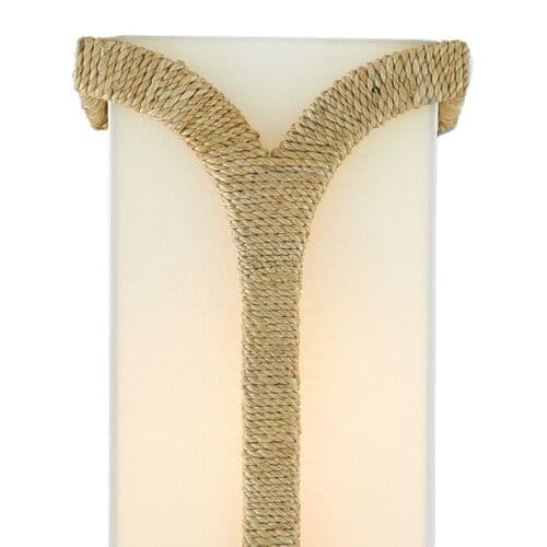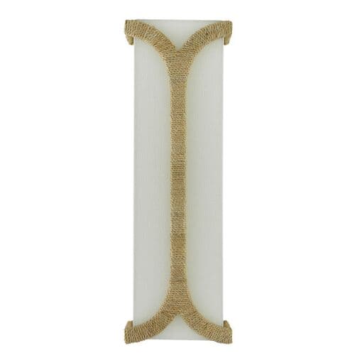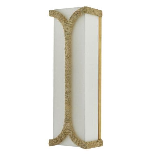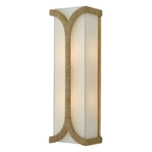 The Carthay Wall Sconce features a curving motif wrapped in Abaca rope that embraces the eggshell linen shade. A design note is how cleverly it arcs from the top of the backplate to affix the shade to the wrought iron frame in a dark contemporary gold leaf finish.