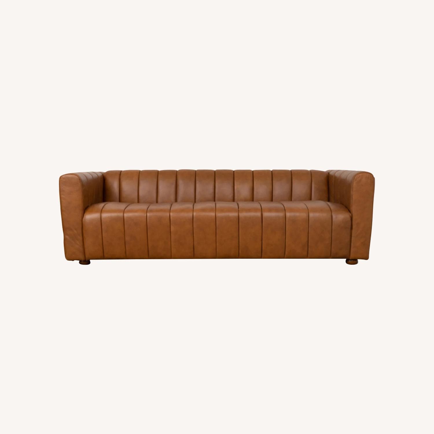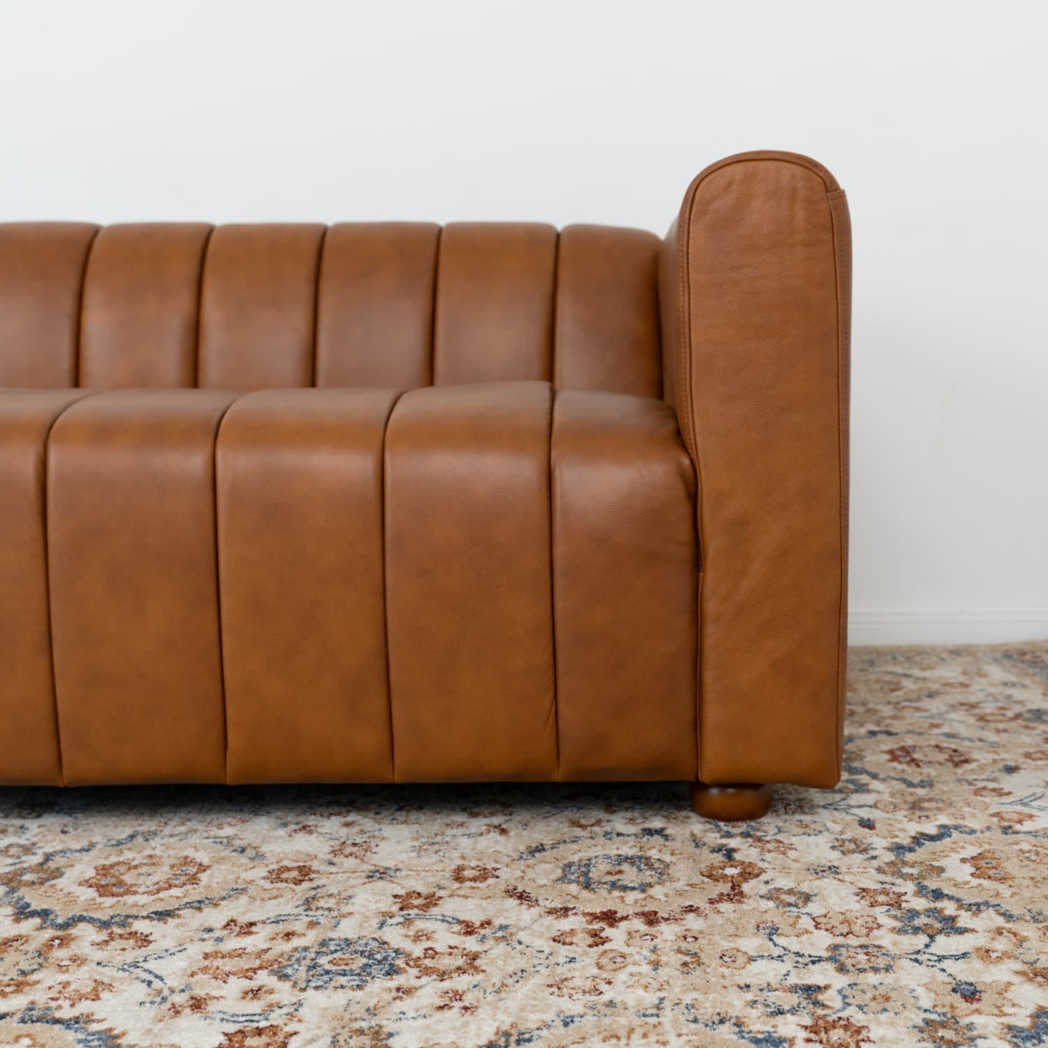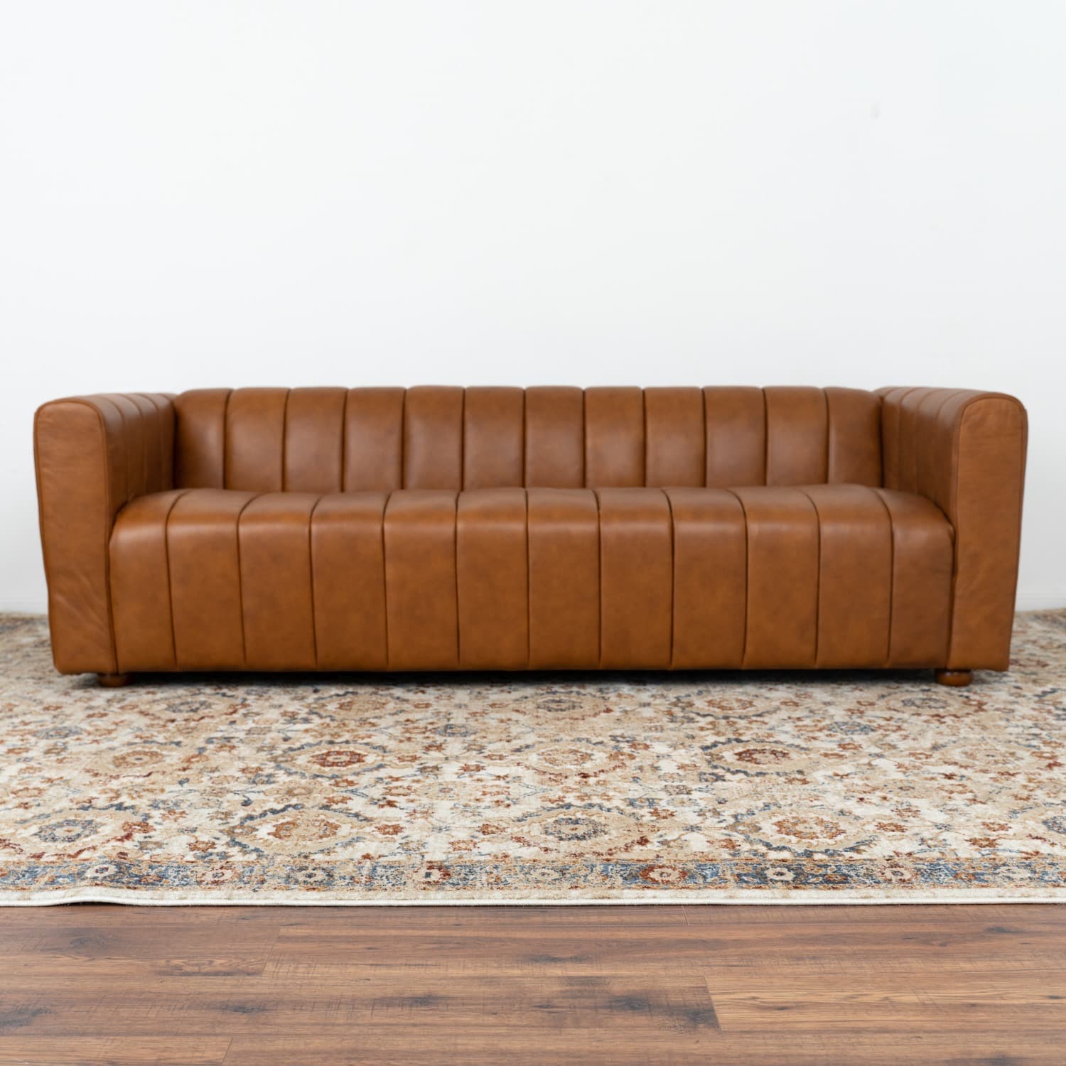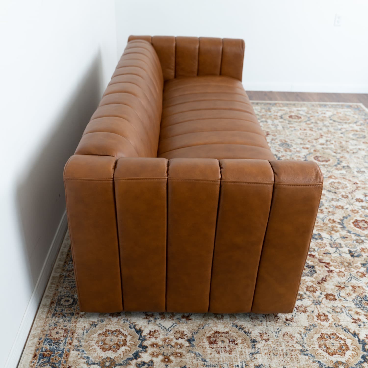 The Clara Leather Sofa showcases mid-century modern design, blending style and functionality. Upholstered in anti-crack, pet-friendly full-grain cognac leather, it features a channel-tufted deep seat and a tight seat/back design for ultimate comfort. Its kiln-dried wooden frame ensures durability, while its easy maintenance makes it an ideal choice for any home.