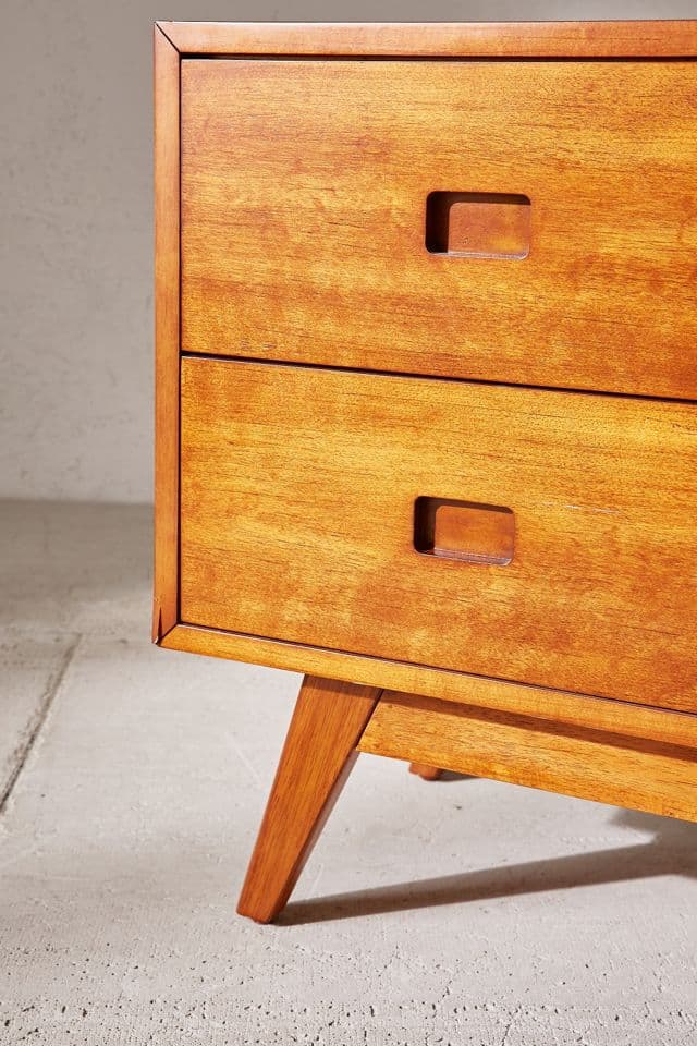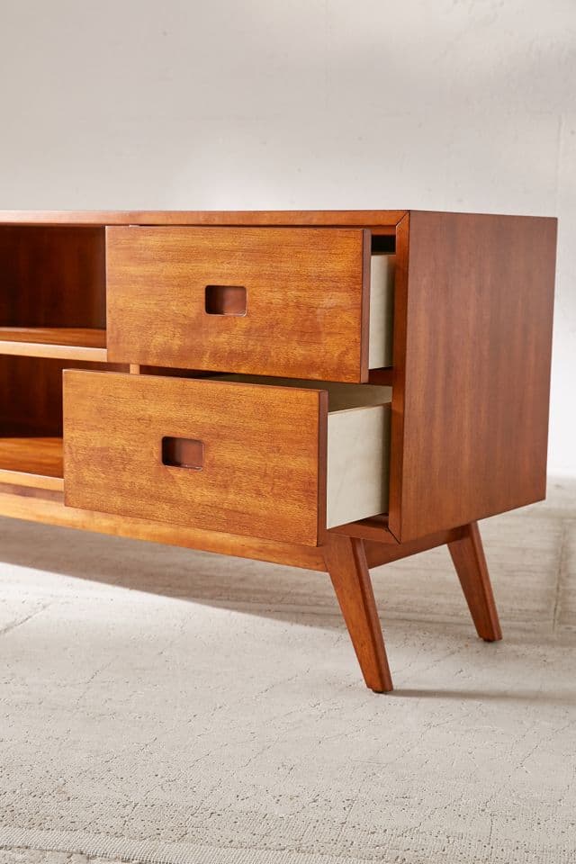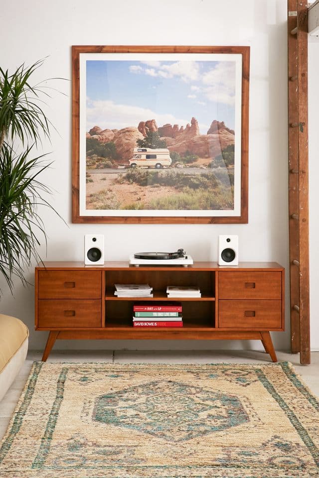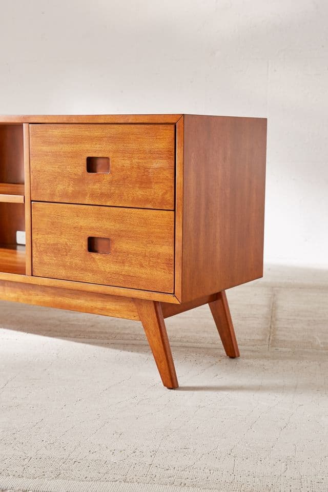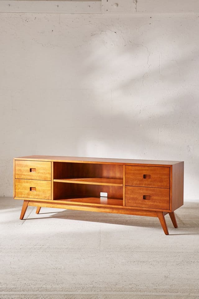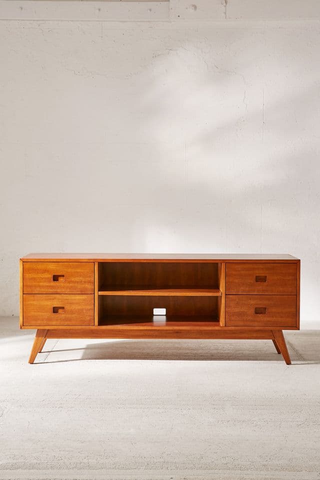 Customize your entertainment center with this mid-century modern media console. Complete with 4 drawers + open shelving in the center for vinyl, books + more. Tapered legs complete this sleek piece and provide room for additional storage underneath. Some assembly required. UO exclusive.