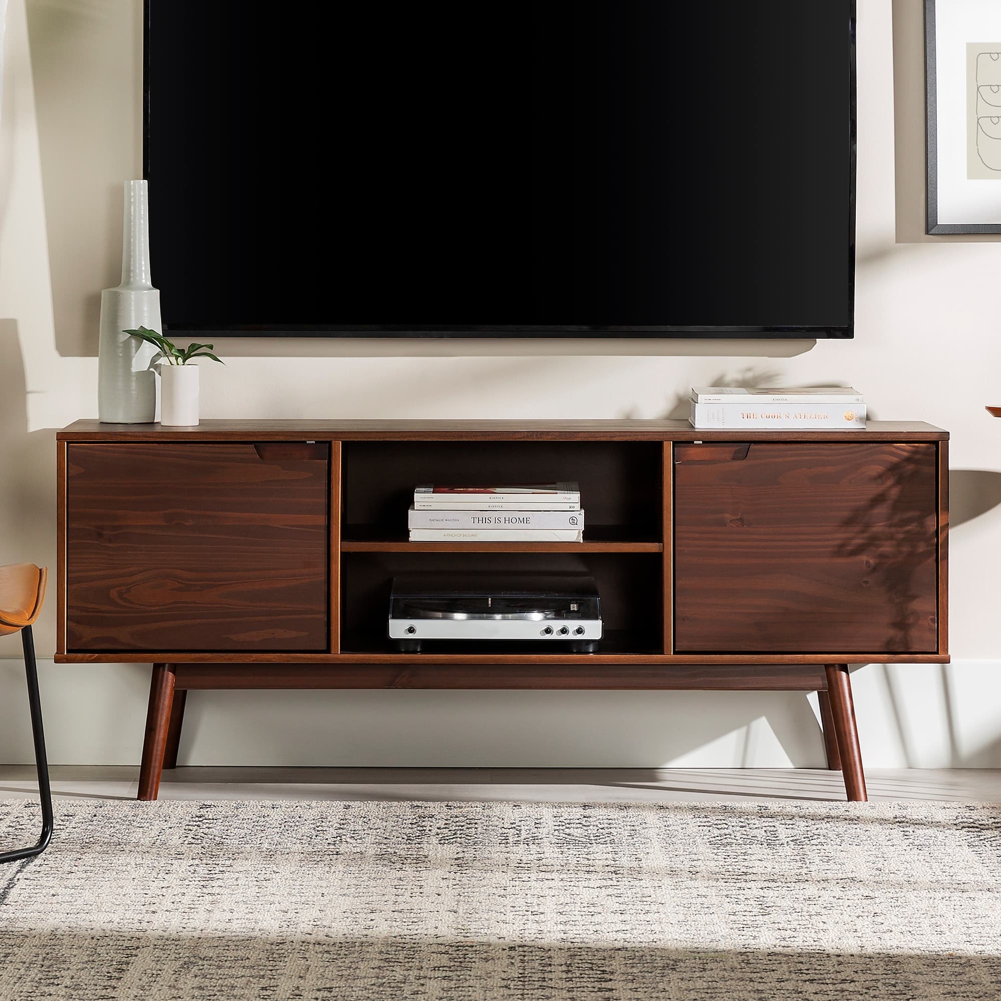 Elevate your living room décor with the charming and sturdy 58-inch TV Console from Middlebrook Designs. With its mid-century style, this console features a center open shelving area, perfect for media and game components, and two doors with cut-out handles that keep your movie and game collections out of sight but within reach. The solid pine wood construction with a stained varnish finish accommodates most flat panel TVs up to 65 inches. Bring home this sleek and durable TV stand and enjoy its functional beauty for years to come. Features: