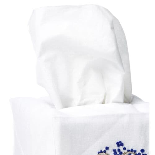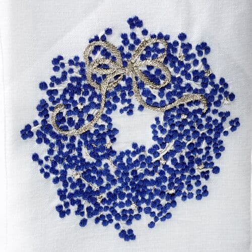 Available exclusively through One Kings Lane, this elegant tissue box is crafted from crisp white linen and adorned with a hand-embroidered festive wreath design.