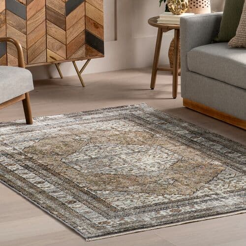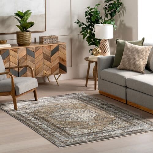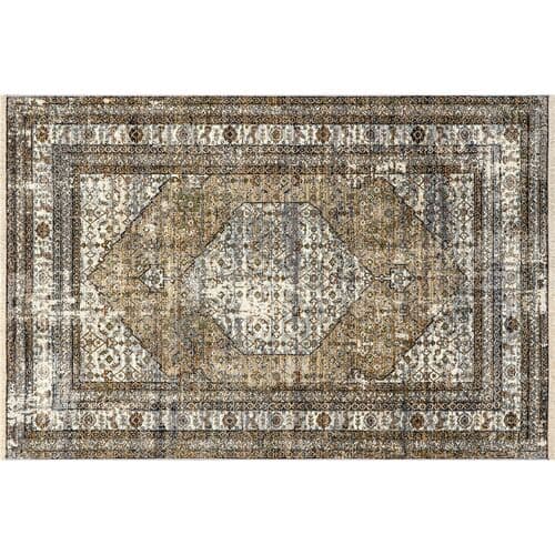 Elevate your space with this traditional medallion fringe area rug. This floor covering features a beautiful color palette that is purposefully distressed to mimic that iconic vintage look and has dainty 1 fringes lining both ends. Machine made using durable polypropylene, this rug is built to last in high traffic areas of your home. Look no further with our easy to care for and pet-friendly area rugs.