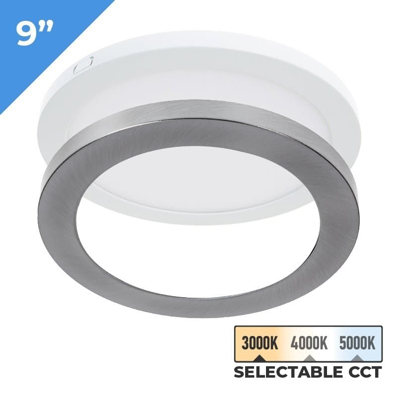 TCP 9" LED Slim Flush Mount Fixture - Satin Nickel Trim Ring - 18W - Selectable CCT - Dimmable - Up To 1,370 Lumens