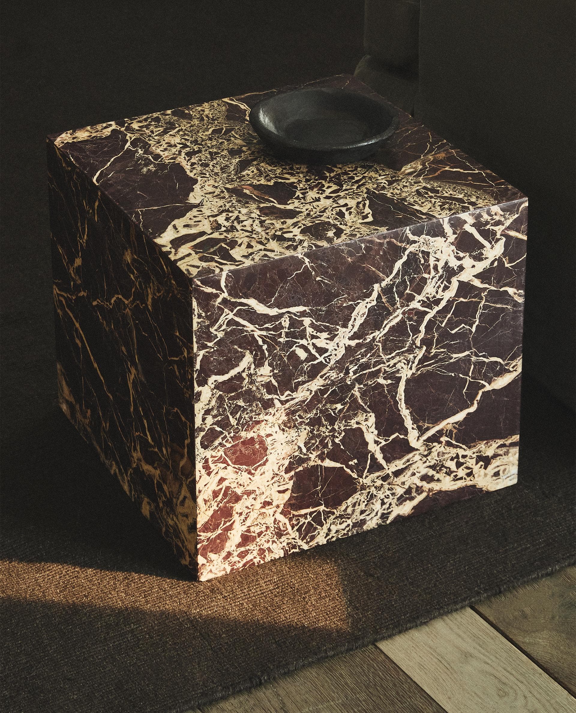 Side table made of red marble in the shape of a cube.Nanushka is a fashion brand founded in Budapest in 2005 by Sandra Sandor. It is renowned for its aesthetic that blends bohemian influences with modern, urban touches. The shared enthusiasm of the Nanushka and Zara Home teams is evident in the scale and ambition of this collection, which showcases a vibrant kaleidoscope of surfaces and textures—an approach that Sandor describes as “The East meets the West”.