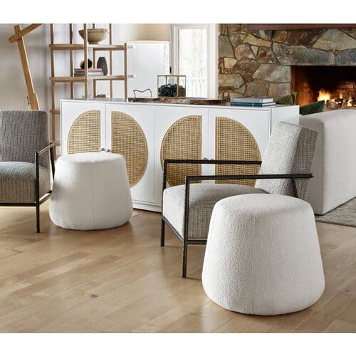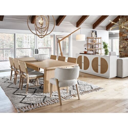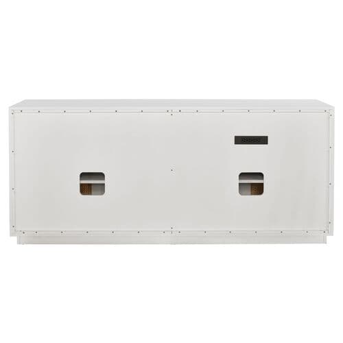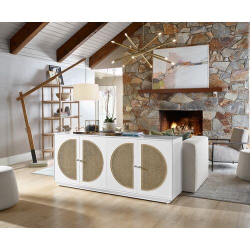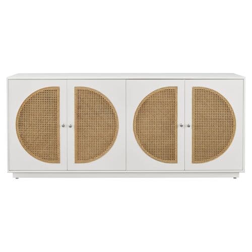 Semicircular cane panels on the four doors create a textural and tonal contrast with the smooth white finish. Each pair of doors conceals an adjustable shelf, a tray drawer, and a rear cutout for cord management. Additionally, the credenza includes four rear outlets.