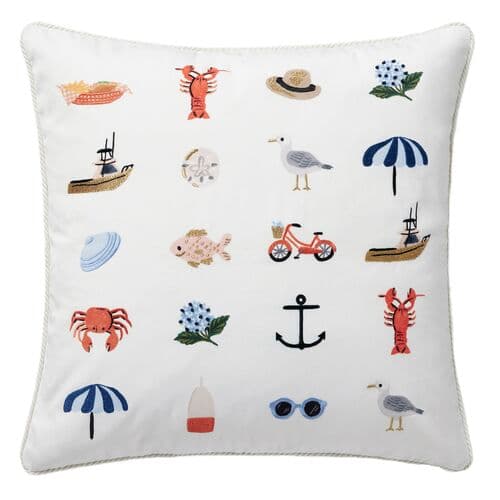 The Sea Side Pillow features a charming coastal design with vibrant sea-inspired motifs set against a crisp white background. This playful and bright pillow adds a refreshing touch to any decor, perfect for beach-themed or casual spaces.