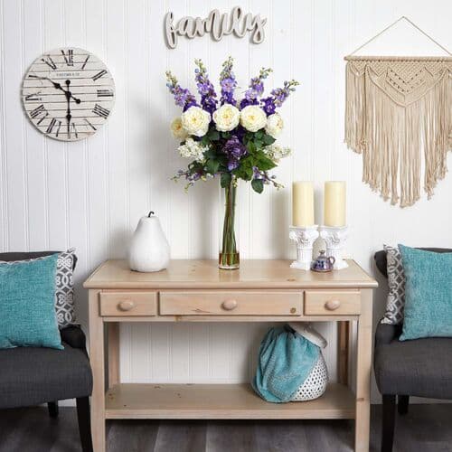 Brighten any room with this arrangement of faux—but beautifully realistic—delphiniums, lilacs, and roses. More than three feet tall, the bouquet comes in a slender glass vase filled with acrylic "water" for added verisimilitude.