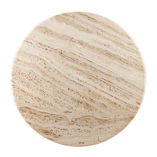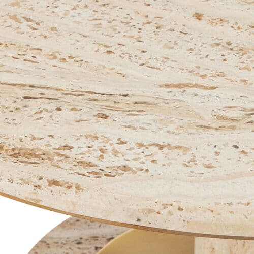 Made of travertine and brass, the Miles Travertine Cocktail Table has a telescoping personality. The interplay of metal and stone is a sophisticated aspect of this design, as the travertine column at the bottom of its stem-like pedestal has been drilled so the metal slices through it. The warmth of the finish on the metal draws out the darker veining in the natural material.