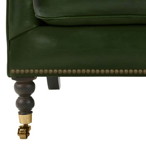 Exclusive to One Kings Lane: From its luxurious leather upholstery to its brass nail-head trim and turned front legs, the Margot Leather Chair is the ultimate in timeless elegance and sophistication. With ample feather-and-down cushioning, it offers supreme comfort, making it a perfect addition to any living space. Also of note:• Brass casters on the front legs enhance the design and allow for easy movement without scratching your floors.• Frame: constructed from solid kiln-dried hardwood for exceptional durability.• Cushion Fill: cloud cushion featuring a high-resiliency foam core wrapped in a super soft foam layer, then inserted into a channel-quilted casing filled with a blend of 50% fiber, 5% down, and 45% feather.• Seat Construction: sinuous-springs system with heavy-gauge steel springs for uniform comfort, reinforced at each end to withstand the wear and tear of everyday use.• Seat Comfort: plush yet supportive, requiring regular fluffing and rotation to maintain the cushions' shape.