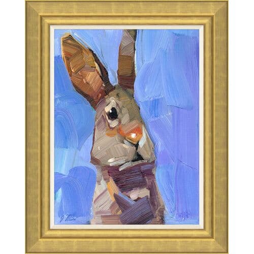Bold brushwork and layers of color give this painting of a rabbit an inviting vitality. The giclée reproduction of the work by the pseudonymous Joseph Moto arrives framed and ready to hang.