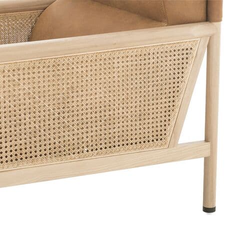 This chair combines top-grain leather, durable ash wood, and rattan cane for a sophisticated aesthetic with a clean-lined design. S-spring seat construction paired with generous cushioning ensures lasting comfort and durability.