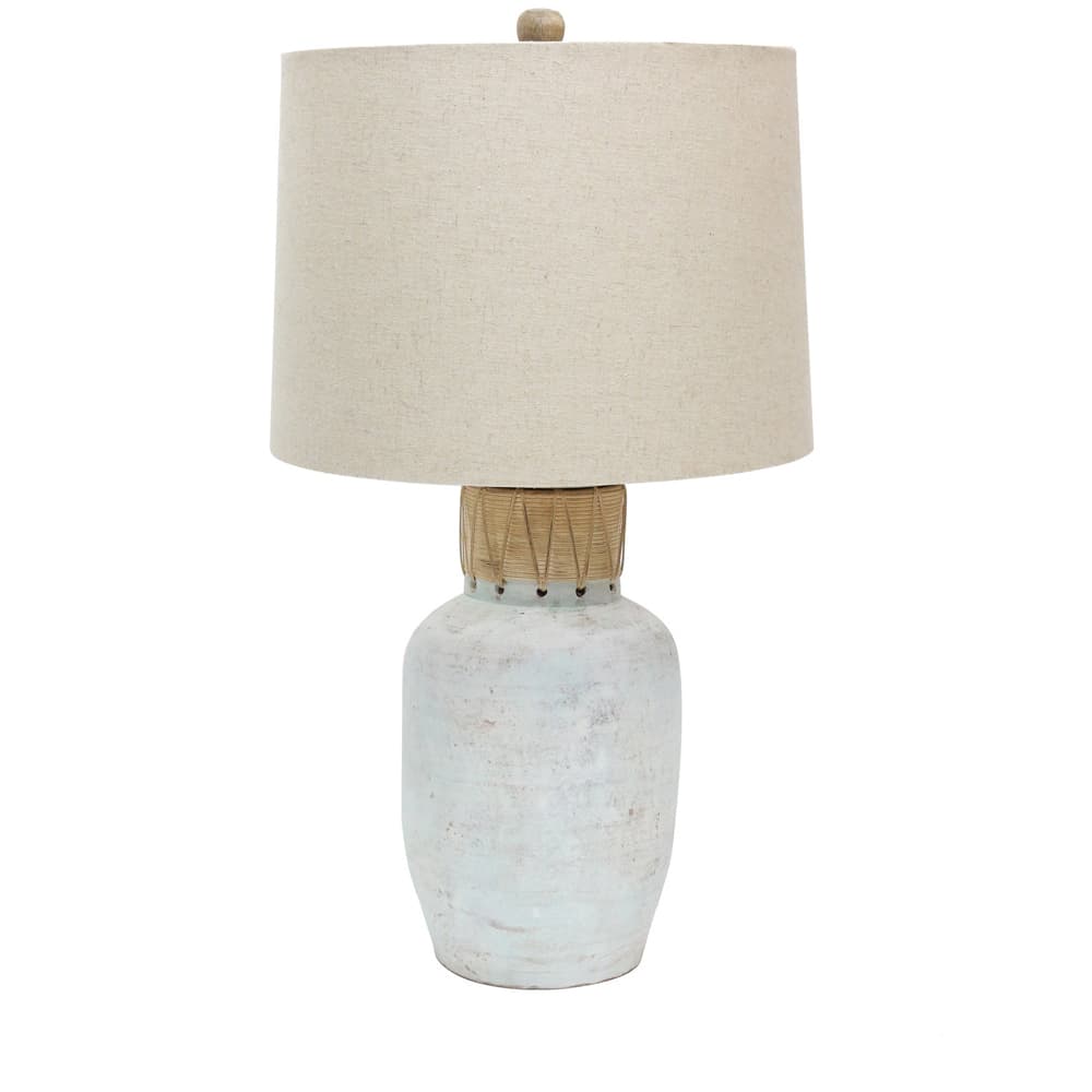 The Crestview Collection Isla Cane Wrapping Table Lamp brings a rustic, coastal element to your home. Made of terracotta, this body features a distressed white finish. The neck of the lamp is wrapped in cane, creating a unique look. A natural linen tapered shade sits atop the lamp.