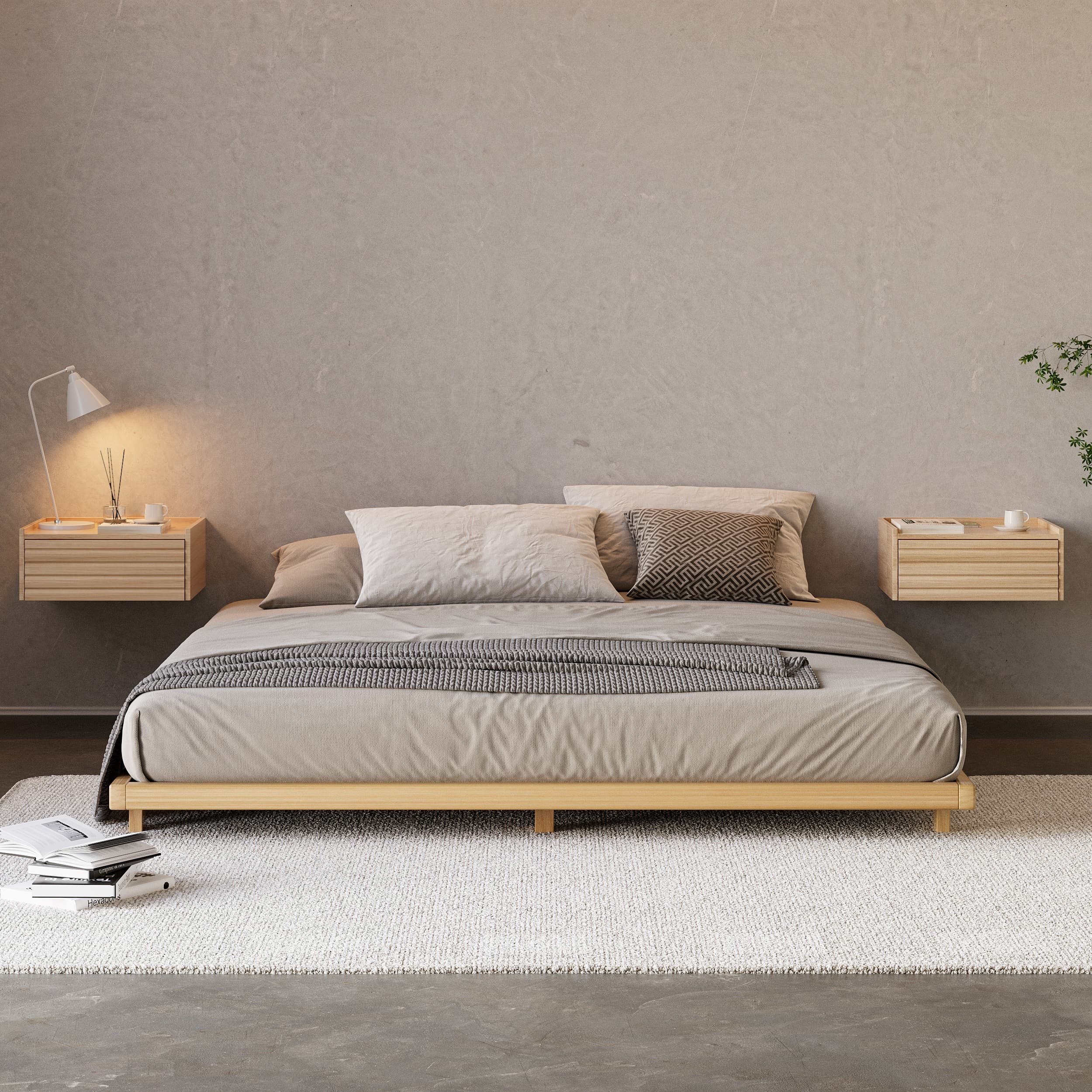 Wooden Floating Nightstand Modern Bedside Table with Charging Station Japanese Style King Low Bed Frame Natural Floor Bed