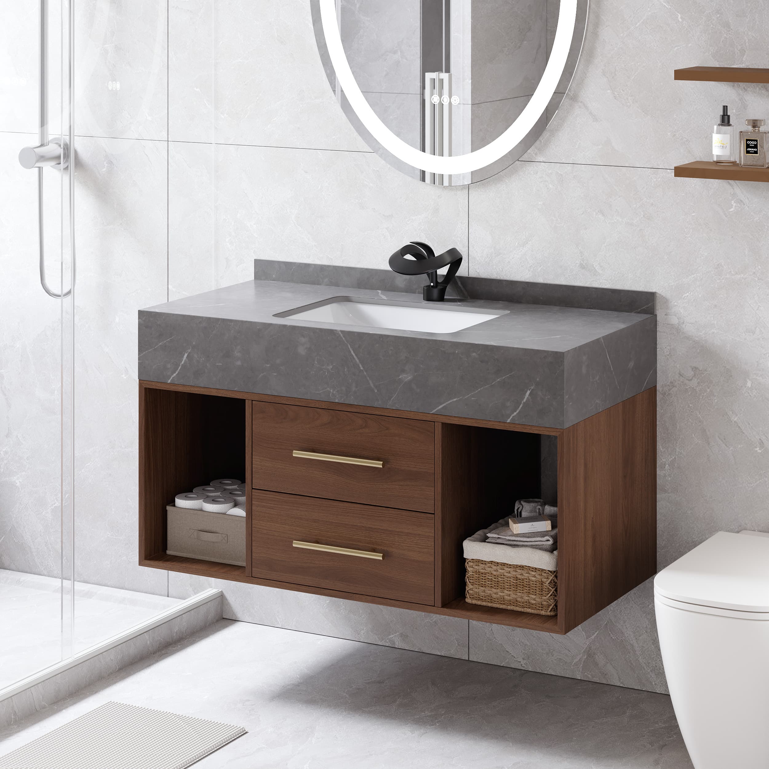 Combining an aura of minimalism and multifunctional style on a grand scale, this wall-mounted vanity set is versatile enough to fit many bathroom styles. The rectangular sink is integrated into the sintered stone countertop for flawless aesthetics, while a single hole is drilled for a faucet of your choice. With a smooth countertop, it offers a spot to stash your morning routine must-haves. Boasting a large drawer, it offers ample room for clothes, toiletries, hairdryers, and other sundries, while the shelf allows for crisp towels, bathroom wares, and gadgets. Please note that the mirror is not included. Capture the grace and charm of contemporary with this delightful bathroom vanity set! 35.4"W x 17.7"D (1500mmW x 450mmD x 400mmH) vanity provides ample storage space. Sintered stone vanity top for easy cleaning. Vanity top is pre-drilled for a single-hole faucet (faucet not included). A wooden drawer provides ample storage. With overflow hole to help promote a bacteria-free environment. Includes a ceramic vessel sink, a sintered stone top, and a wooden drawer. Easy to install with minimal assembly required.