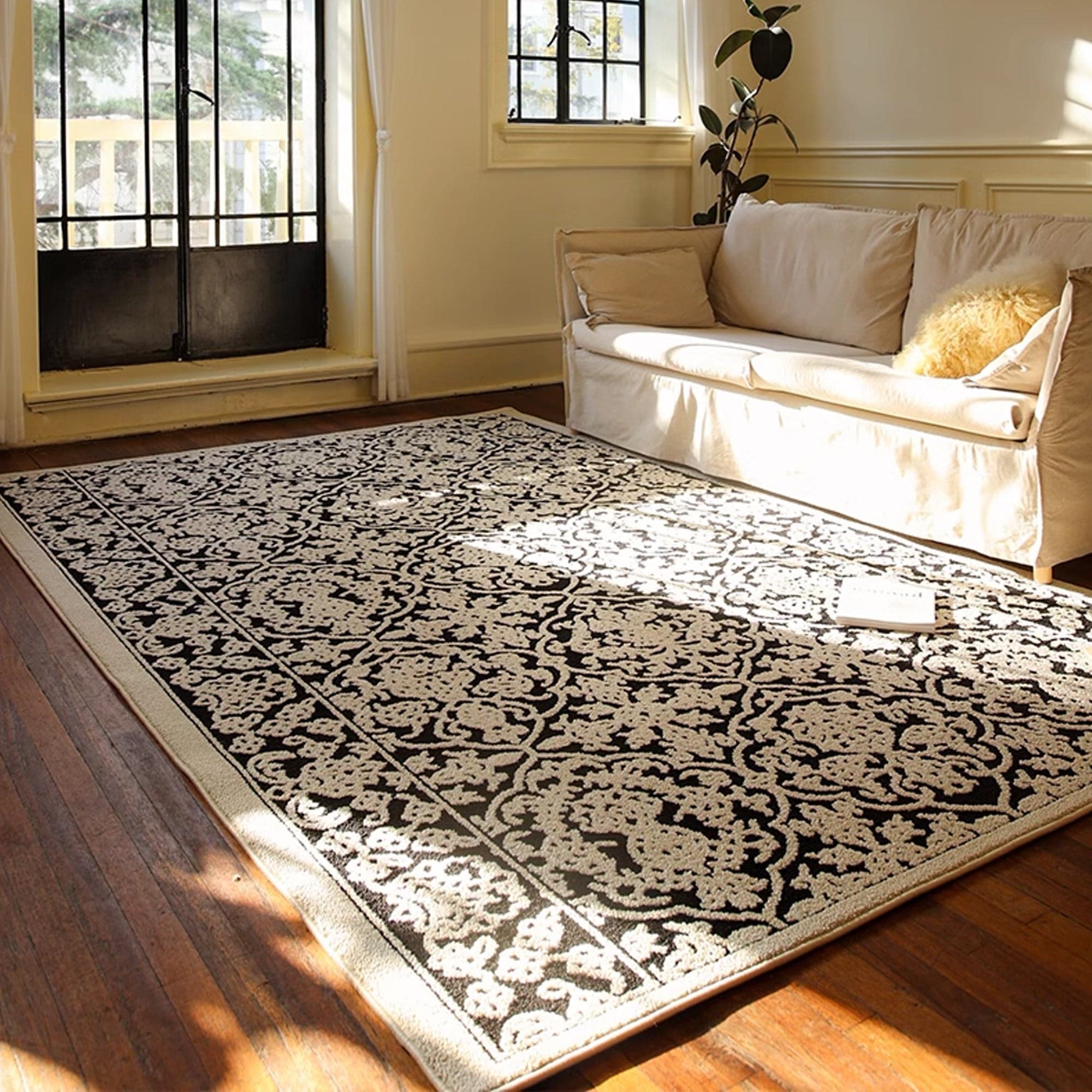 Slashop Easy Clean Rug White Damask Spillproof Pet-Friendly Living Room Large Area Rug - Elegant Ebony