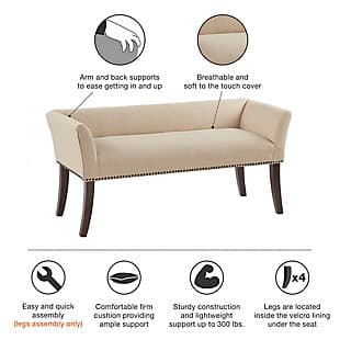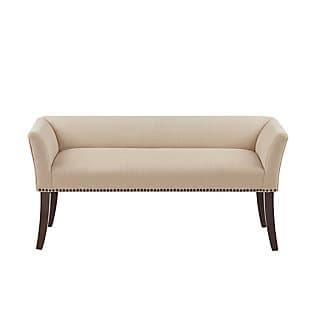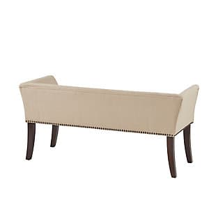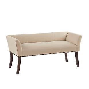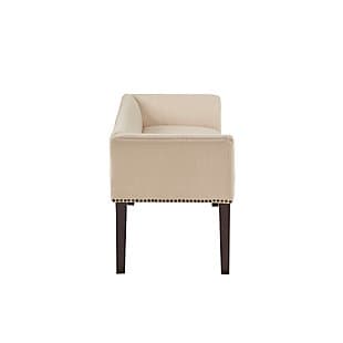 Accent your home with the simple elegance of the Madison Park Welburn Accent Bench. Upholstered in a cream color fabric, this bench features a low back and flared arms that create a sleek and sophisticated look. A bronze nail head trim adds elegant accent, while the light wood finish complements the upholstery. Perfect for your bedroom or living room, this upholstered bench provides a chic update to your home decor. Assembly required.