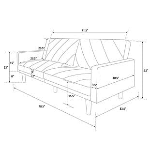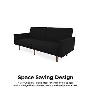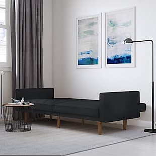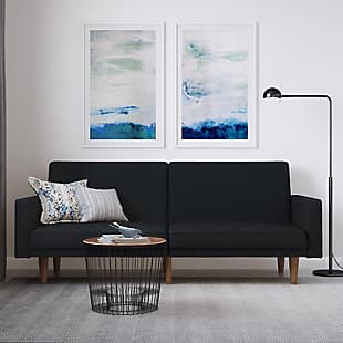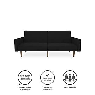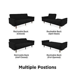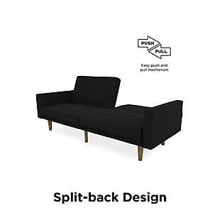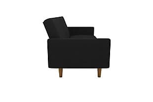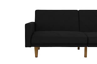 Fashion trends in furniture design are bringing back the days of bold lines, low-profile shapes and wood accents. The Paxson futon combines all three for a look that will add modern-retro flair to your home. Distinctive touches include intricate diagonal stitching and rounded solid wood legs in a warm finish. Thanks to the split-back design of this futon, you can sit, lounge or recline the cushions fully to host overnight guests.