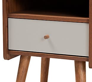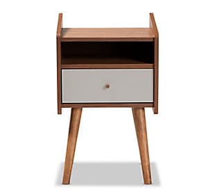 Accent your bedroom with the visually stunning and handy Elario nightstand. Made in Malaysia, the Elario is constructed from sturdy wood showcasing a unique two-tone finish of gray and walnut brown. One drawer provides the Elario with concealed storage, while the open shelf and tabletop can organize other bedside essentials. Requiring assembly, the Elario is supported by angled legs for a touch of retro charm. Guard rails complete the distinctive look, making the Elario nightstand an excellent addition to any space.