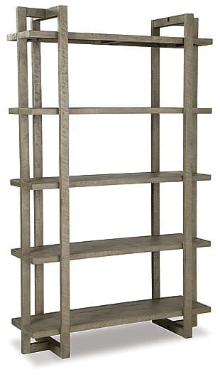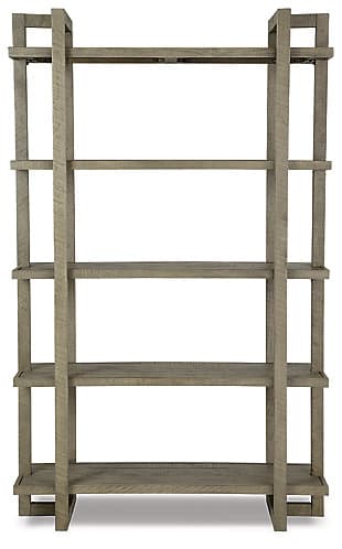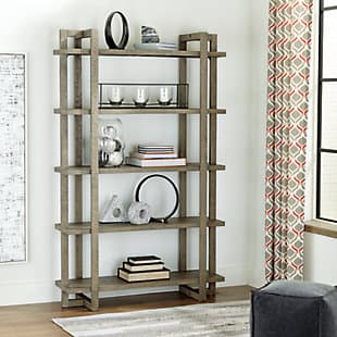 Clean-lined with an architectural attitude. The Bergton bookcase offers a new take on relaxed refinery. Five shelves provide plenty of space for your personal library or decorative pieces. Dressed in a distressed gray finish, it suits a myriad of modern and casual color palettes.