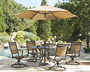 The best part of dining out includes the Carmadelia 7-piece outdoor round dining set. Supple yet supportive PVC sling seats melt the cares of the day away. The glass tabletop, hand-painted to resemble leather, is a visual treat. Included 9' octagonal patio umbrella set with multicolor canopy, dark brown tilting frame and smooth hand crank shade you from the sun all day. Umbrella’s PVC fabric canopy blocks out harmful UV rays, while the easy auto-tilt frame follows the arc of the sun. Durable powdercoated finish protects the rust-resistant aluminum frames from corrosion and fading. Seats four.
