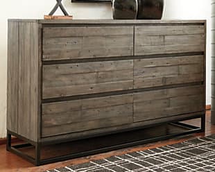 Earthy essence with an urban edge. The ample Cazentine dresser graces your space with a fresh aesthetic. Pine wood is finished in a rustic, dark gray hue to highlight its weathered appeal. Sturdy black metal base supports the boxy silhouette. Hardware-less approach keeps this dresser ultra minimal in design with maximum style.