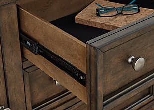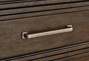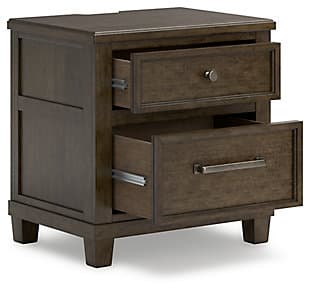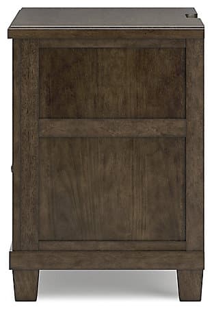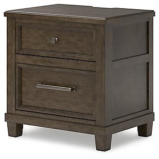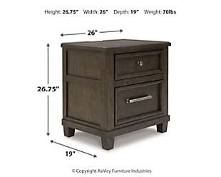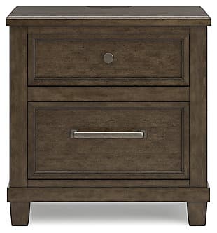 With its rich dark brown wood finish, the Hillcott nightstand gives modern farmhouse styling a substantial sensibility. Two spacious drawers house bedside essentials, while dual charging ports keep your electronics at the ready. A hidden storage bin in the lower drawer offers a secret spot for personal items. The beautiful and sturdy silhouette elevates this nightstand into a statement piece that’s timeless, functional and versatile.