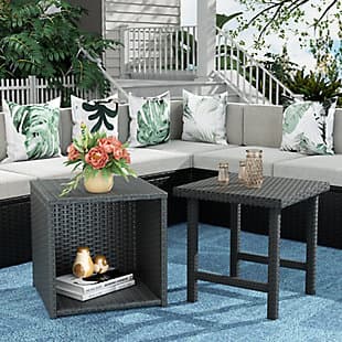 This must-have patio end table set is constructed of durable woven rattan wicker that is tightly wrapped around a rust-resistant steel frame providing long lasting weather-resistant protection. The two-piece set features adjustable leg levelers and is resistance to water, stains and UV light. Easy to assemble and clean, this outdoor set requires minimal maintenance.