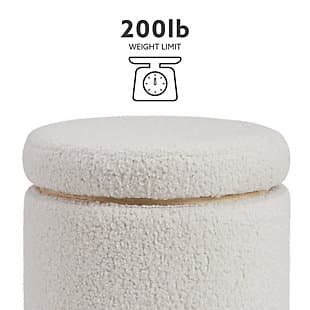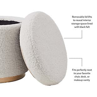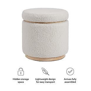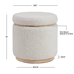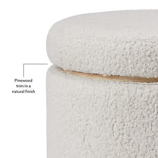 Multifunction never looked so good. This space saving piece offers a comfortable place to sit or rest your feet, and it provides convenient storage under the removable lid. Natural wood trim accents the comfy natural sherpa fabric that covers the top and side panels. The finished storage area is great for shoes, blankets or remotes. Use next to your favorite chair, desk, make up vanity or anywhere an extra seat or foot stool are needed.