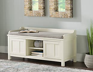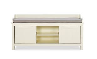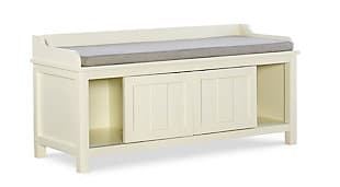 The Macon Storage Bench is perfect for adding storage and seating to an entry or hall. The bench provides ample bottom storage space for shoes, books and toys. Sliding doors keep your items hidden from sight. The white finish is an easy addition to any space. A plush cushion adds comfort to the seat.