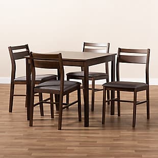 A clean design and neutral color palette make the Lovy dining set an effortless addition to any space. Constructed from solid rubberwood and engineered wood in a dark walnut finish, this dining set includes one table and four chairs. The table features a classic square top, ideal for playing cards or having a casual meal. Each chair is upholstered in a soft, foam-padded polyester fabric and is built with a slanted back for endless comfort. The compact size of the Lovy set makes it ideal for small kitchens and dining rooms. For added convenience, all five pieces in the set will arrive in one box. The Lovy dining set is made in Malaysia and requires assembly.