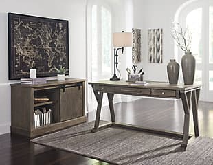 Work the latest trend in casual farmhouse living with the Luxenford credenza. Charming elements include a wire brushed gray-brown finish that’s easy on the eyes, along with a sliding barn door providing access to both sides of the shelved storage space. Making this home office essential all the more unique: a faux bluestone inset on the top surface for a mixed media twist.