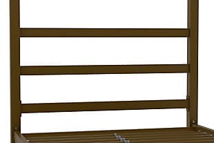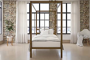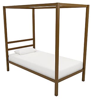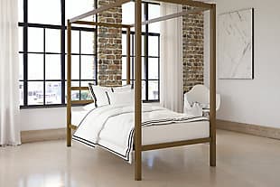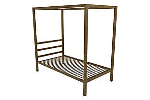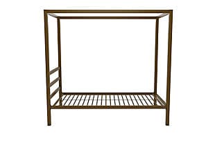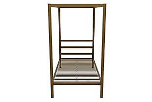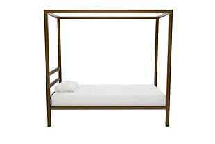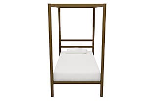 Modern meets medieval influences with the Modrey twin canopy bed. Ultra clean lines make this simply striking canopy bed with goldtone finish a natural complement for so many settings. Along with a sturdy metal bed frame, this quality crafted canopy bed includes metal side rails for stability and durability and a metal-slat base that not only provides support and mattress ventilation but also eliminates the need for a foundation or box spring, Now that’s a breath of fresh air.