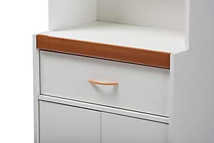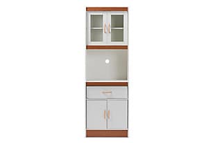 Who says shelving units can’t be chic? This two-tone cabinet provides plenty of storage options. Open cubby space features a cut-out for cord management making it ideal for a microwave or just a small lamp. Upper cabinet doors with glass panels create a distinctive display space, while the pull-out drawer and lower cabinet keep knick-knacks or kitchen essentials neatly tucked away. A wonderful addition to small spaces or anywhere in need of a fresh spin on style.