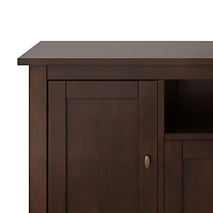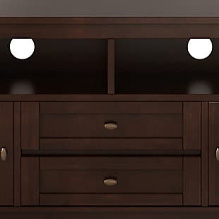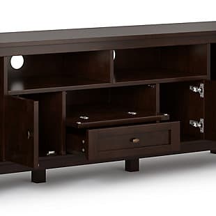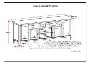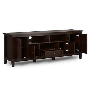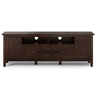 This rustic, extra-wide TV stand with Shaker-style doors makes a stylish and functional base for your home entertainment system. Crafted of solid wood, this piece features both open and closed storage options, elegantly tapered legs and a tabletop with crown-edged moulding. The media stand is perfectly sized for TVs up to 80 inches, with plenty of storage space for all your media and gaming devices.
