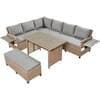 Combined with 2 loveseats with side tables, 1 corner sofa, 1 long bench and 1 dining table, our 5-pieces rattan sofa set can provide 7 seat capacity for you with your friends to enjoy your Sunny time. Built with strong but light-weight PE rattan wicker, this patio sofa set is designed to be all-weathered with UV resistant and water resistant. This 5-piece furniture set is the best choice for you.