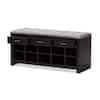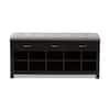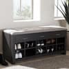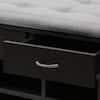 You cant ask for a redo when it comes to first impressions, which makes the preservation of an entryway's integrity so important. Our Espresso Entryway Bench boasts a contemporary look and strong storage capabilities to keep your entryways free of clutter and full of style. With space often at a premium, you want fashion and functionality - no need to sacrifice either one. Underneath the Espresso Entryway Bench's foam-padded, gray fabric upholstered seat are ten shoe-storage cubbies plus three drawers for holding such close-to-the-door essentials as keys, umbrellas and pet leashes. Made in Malaysia, this bench requires assembly.