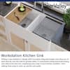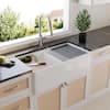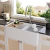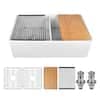 The White Fireclay 33 in. Double Bowl Farmhouse Apron Workstation Kitchen Sink with Accessories is a premium quality kitchen sink that is designed to elevate the functionality and aesthetics of your kitchen. With a spacious double bowl design, this sink provides ample room for washing and rinsing dishes, preparing food, and even soaking large pots and pans. The farmhouse apron style gives it a timeless and elegant look that complements any kitchen decor, while the sleek and modern workstation design makes it a highly functional and versatile addition to your kitchen.
