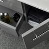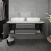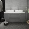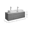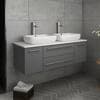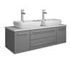 Classically simple with clean lines and 2 beautiful vessel sinks, this Fresca Lucera Wall Hung Modern Bathroom Cabinet will bring out the best in any bathroom. Measuring 48 in. width, this sophisticated cabinet has a well constructed solid wood frame with 2 roomy storage compartments for holding bathroom essentials and 2 spacious drawers with a decorative beveled drawer plate design. The doors and drawers are soft-closing and feature slim brushed metal handles. This modern cabinet has a chic painted Gray finish. Gracing the top of the cabinet is a striking quartz stone countertop with 2 white vessel sinks. Each sink is equipped with an integrated overflow and single hole vessel faucet mount, ready for the faucets of your choice (sold separately). This cabinet includes installation hardware and is available in several sizes and finishes to meet your decorating needs.