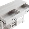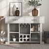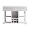 Keep your wine stored in an organized way with this white wood wine bar. A built in wine rack lets you store up to 6 standard bottles of your favorite wines, 4 open space shelves are great for showing off display plates or mugs, decor, bar accessories, and handles of your preferred spirits, while 2-drawers for storing silverware or smaller bar accessories. The center upper console features easy to reach 3 stemware racks that can hold up to 9 stemwares. Dark metal pulls allow easy access to the drawer.