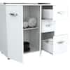 Inval Microwave Storage Cabinet finished in Laricina-White laminates. Executed in solid composite wood, double laminated durable melamine which is stain, heat and scratch resistant. This storage cabinet with space for a microwave features 4-doors which conceal ample storage space, as well as 3-drawers with slides for accessories. All doors and drawers have brushed metal handles. Unit sits on four casters, 2 of which are lockable to allow the cabinet to stay securely in place.