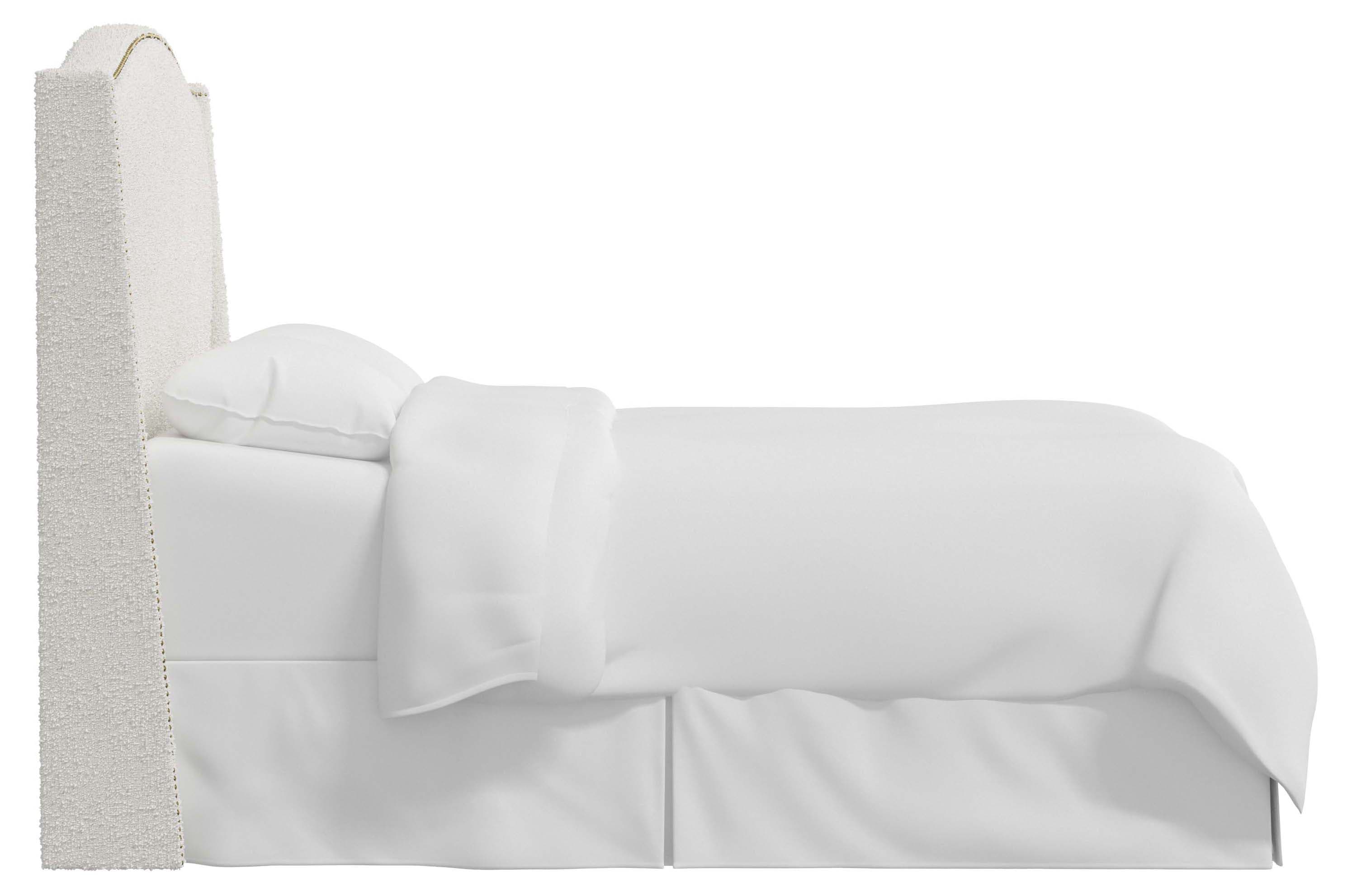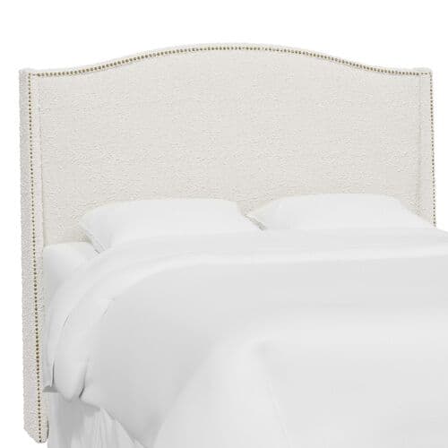 Updating a bedroom's look is simple by changing the headboard. This wingback headboard adds timeless elegance to a room. Brass nailhead trim highlights its distinguished silhouette and plush bouclé fabric; ample cushioning offers comfortable support while reading or watching TV. Made in the USA, it attaches to any standard bed frame.